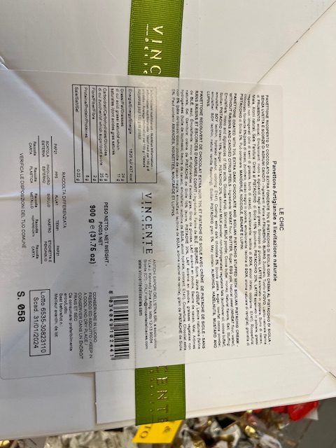 ]INGREDIENTI :Farina di FRUMENTO, BURRO, Zucchero, Tuorlo d’UOVO, Lievito naturale (farina di FRUMENTO, acqua), Emulsionanti: mono e digliceridi degli acidi grassi, Sciroppo di glucosio, LATTE scremato in polvere, Burro di cacao, Miele, Aromi naturali, Sale. Farcitura: Crema al PISTACCHIO di Sicilia 16% (zucchero, PISTACCHIO 20%, LATTE scremato in polvere, grassi vegetali non idrogenati (olio di semi di girasole, burro di cacao), emulsionante: lecitina di SOIA, alcool idrato, colorante: E141). Ricopertura: cioccolato fondente 8%(pasta di cacao, zucchero, cacao magro in polvere, emulsionante: lecitina di SOIA, aroma naturale di vaniglia), granella diPISTACCHIO di Sicilia 5%. Può contenere MANDORLE, NOCCIOLE, SENAPE E LUPINI.